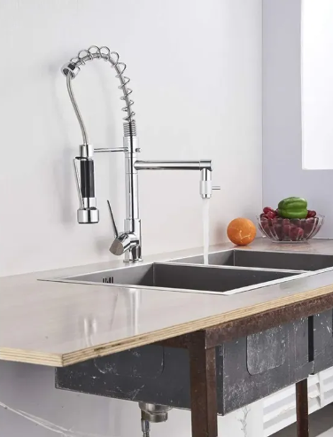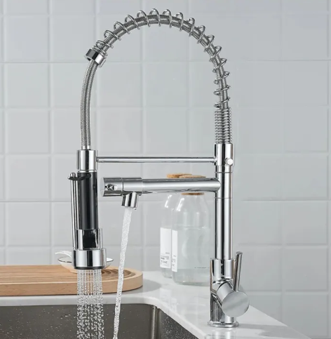 High-quality Pull Out Spring Faucet featuring a 360° swivel spout and dual-mode spray. Designed for convenience, durability, and a sleek modern look — ideal for any kitchen setup.